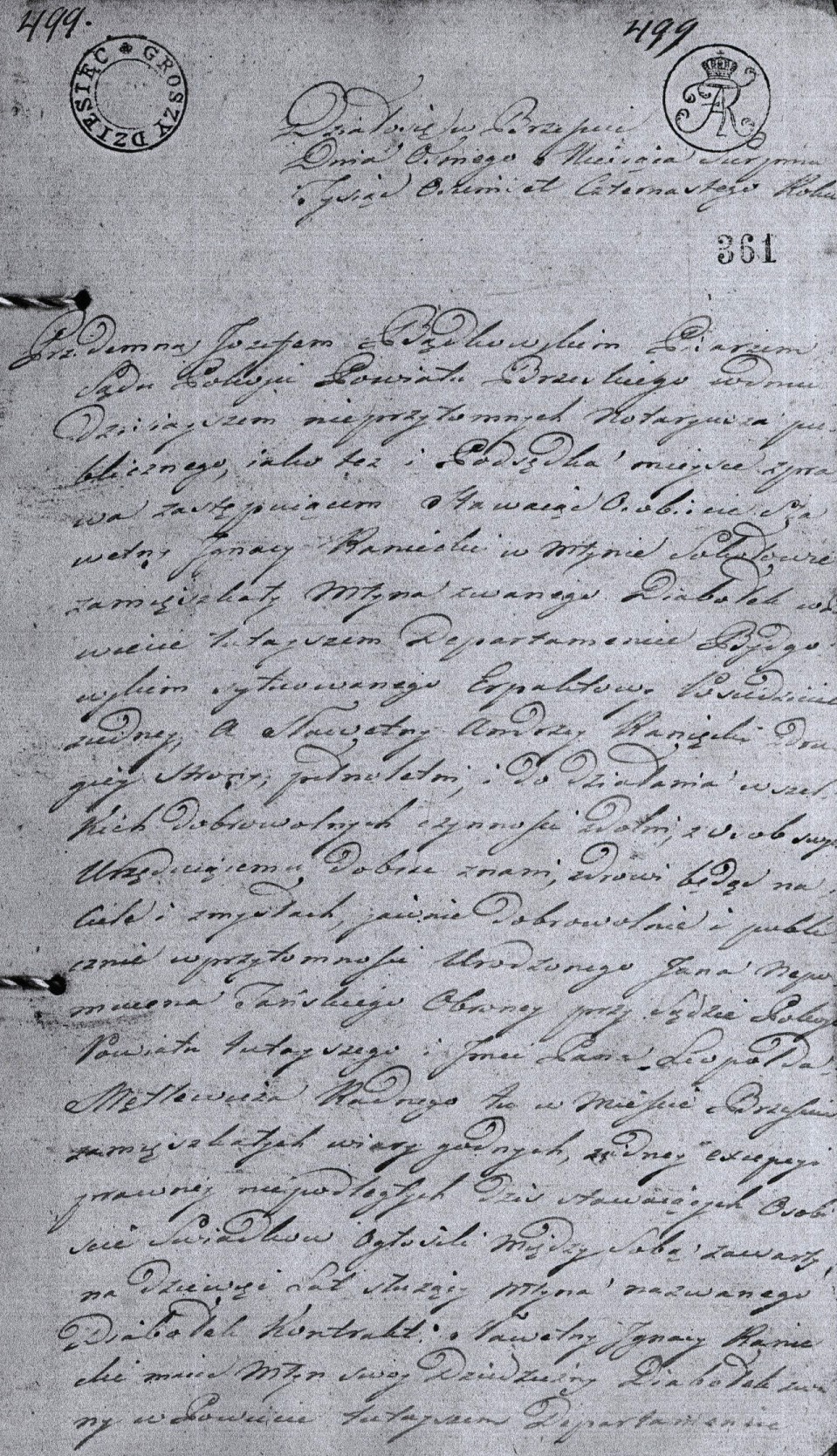 „(…) Gdy jednak strona pozwana na odparcie powództwem jego złożonym przez siebie Przywilejem od Najjaśniejszego nam szczęśliwie panującego Monarchy Polskiego Stanisława Augusta na tenże młyn Diabełek niegdyś pomienionemu Maciejowi Rańcowi brata teraźniejszego powoda samemu i jego małżonce Zofii z Rędzikowskich teraz zapozwanej pozostałej wdowie łaskawie w roku 1765 dnia 22 miesiąca lipca danym przez Najjaśniejszego Króla imć podpisem, pieczęcią Kancelarii Wielkiej Koronnej utwierdzonym, księgami zaś Grodu Kowalskiego w sobotę to jest dnia 6tego miesiąca września roku 1783 oblatowanemu, w Sądzie się naszym broni i tę sprawę Sądowi tutejszemu być niepodległą do rozsądzania konkluduje, i owszem do przyzwoitego Sądu onejże odesłania to jest do Prześwietnej Referendarii Koronnej pretenduje (…)”.